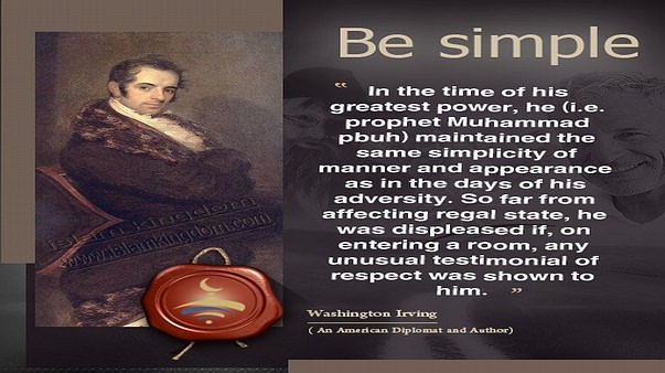 “In the time of his greatest power, he (i.e. prophet Muhammad pbuh) maintained the same simplicity of manner and appearance as in the days of his adversity. So far from affecting regal state, he was displeased if, on entering a room, any unusual testimonial of respect was shown to him.”