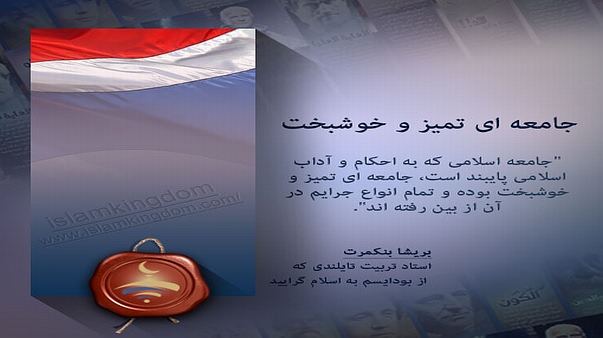 "جامعه اسلامی که به احکام و آداب اسلامی پایبند است, جامعه ای تمیز و خوشبخت بوده, و تمام انواع جرایم در آن از بین رفته اند"