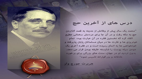 "محمد یک سال پیش ار وفاتش از مدینه به قصد گذاردن حج به مکه رفت. و در آن جا برای مردمش سخنانی عظیم القاء کرد که نخستین فقره در آن عبارت بود از اینکه تمام خونریزی ها و غارت ها در میان مسلمانان پایان پذیرفته و خونخواهی ها به اتمام رسیده است. و در فقره آخری یک مومن سیاه پوست را شایسته خلیفه بودن قرار می دهد. بدون تردید او در جهان سنت های بزرگی برای برخورد عادلانه و بزرگوارانه تاسیس نمود"