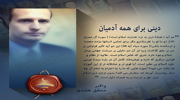 " دو آیه ( همانا دین به نزد خداوند اسلام است) [ سوره آل عمران 19]، (و ما تو را نفرستادیم مگر برای تمامی انسانها مژده دهنده و ترساننده باشی)[ سوره سباء آیه 28] این دو آیه تاثیر فراوانی بر من بر جای گذاشت زیرا در آن دو دلیلی بر سرشت جهانی بودن اسلام است. امری که خاص اسلام است. علاوه از نظام و قوانین دیگری که دارد و توضیحات کامل آن در باره سیدنا عیسی علیه السلام آیا قوی تر و صادقانه تر از این آموزه ها یافت می شود؟ آموزه هایی که ما را به احترام به تمام آن چه دیگر پیغمبران آورده اند سفارش می کند؟ بدون تردید دین اسلام دین حق و درست و به همراه دلیل است".