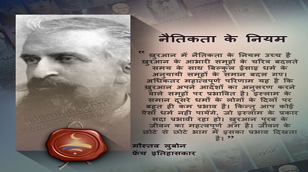 ख़ुरआन में नैतिकता के नियम उच्च है ख़ुरआन के आभारी समूहों के चरित्र बदलते समय के साथ बिल्कुल ईसाइ धर्म के अनुयायी समूहों के समान बदल गए। अधिकतर महात्वपूर्ण परिणाम यह है कि ख़ुरआन अपने आदेशों का अनुसरण करने वाले समूहों पर प्रभावित है। इस्लाम के समान दूसरे धर्मों के लोगों के दिलों पर बहुत ही कम प्रभाव है। किन्तु आप कोई ऐसा धर्म नही पायेंगे, जो इस्लाम के प्रकार सदा प्रभावी रहा हो। ख़ुरआन पुरब के जीवन का महत्वपूर्ण अंग है। जीवन के छोटे से छोटे भाग में इसका प्रभाव दिखता है।