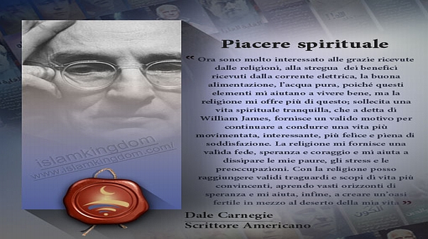 Ora sono molto interessato alle grazie ricevute dalle religioni, alla stregua dei benefici ricevuti dalla corrente elettrica, la buona alimentazione, l’acqua pura, poiché questi elementi mi aiutano a vivere bene, ma la religione mi offre più di questo; sollecita una vita spirituale tranquilla, che a detta di William James, fornisce un valido motivo per continuare a condurre una vita più movimentata, interessante, più felice e piena di soddisfazione. La religione mi fornisce una valida fede, speranza e coraggio e mi aiuta a dissipare le mie paure, gli stress e le preoccupazioni. Con la religione posso raggiungere validi traguardi e scopi di vita più convincenti, aprendo vasti orizzonti di speranza e mi aiuta, infine, a creare un’oasi fertile in mezzo al deserto della mia vita.|